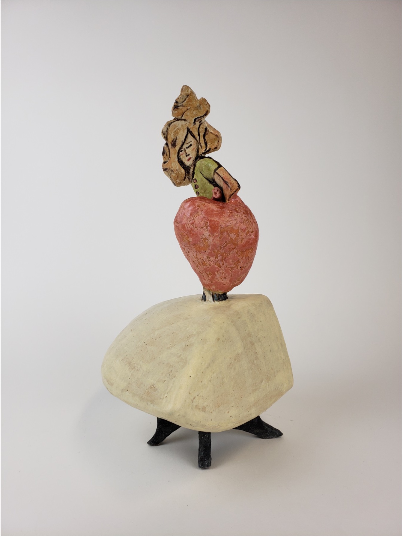 Because I imagine her gathering, picking and spending hours observing flowers in order to better capture their true nature, the ceramic piece I am presenting is a single-flower vase in the shape of a woman. Tucked into a gap in the hollow of her dress is a small pink ceramic flower. This flower is removable. It can be lifted and replaced with a real flower, picked and placed there to be observed or drawn.
